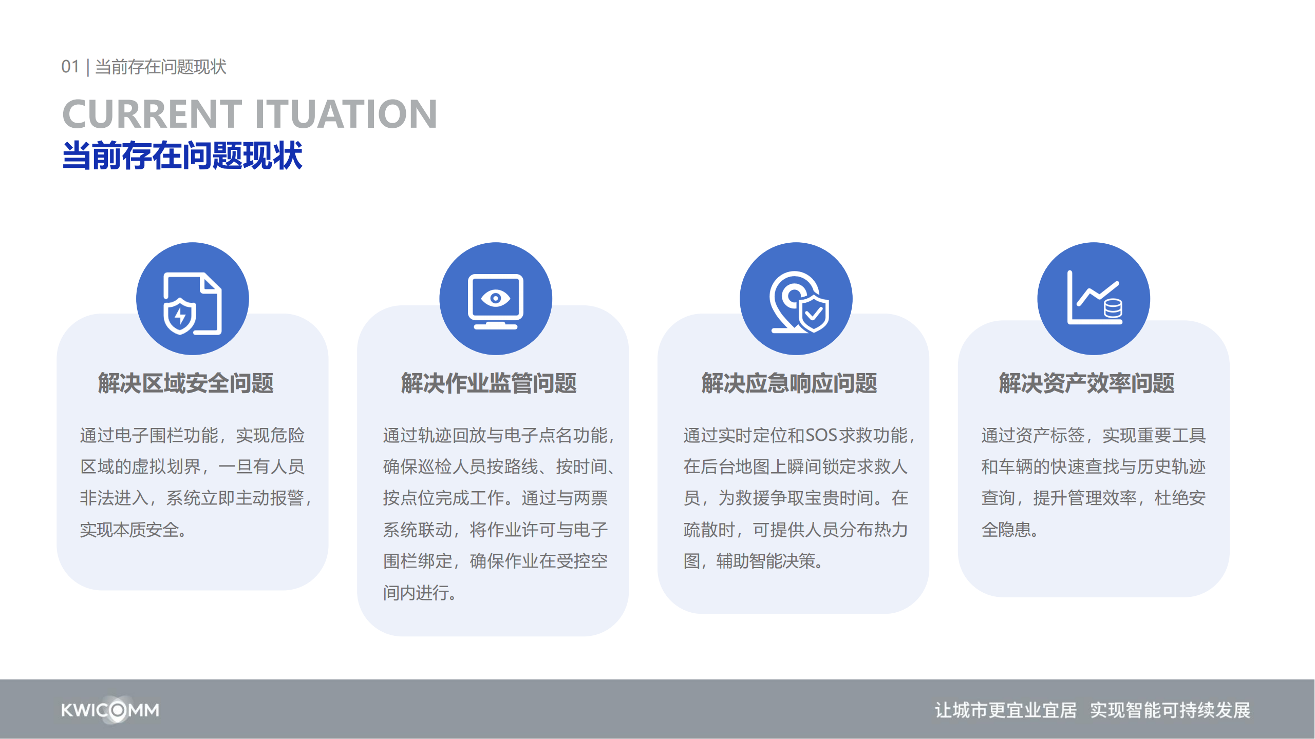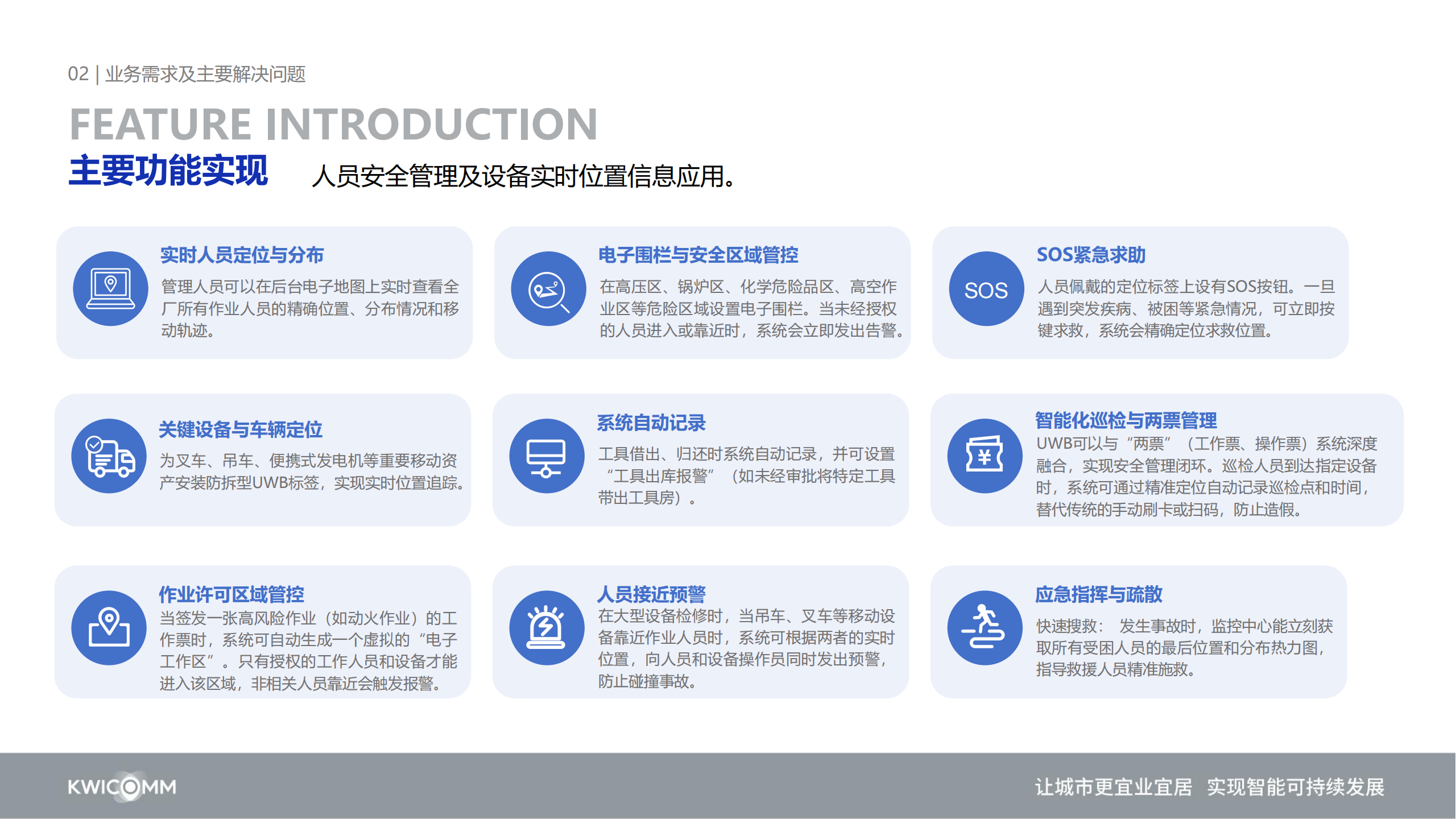 1、解决区域安全问题, 通过电子围栏功能,实现危险区域的虚拟划界立即主动报警,实现本质安全。
